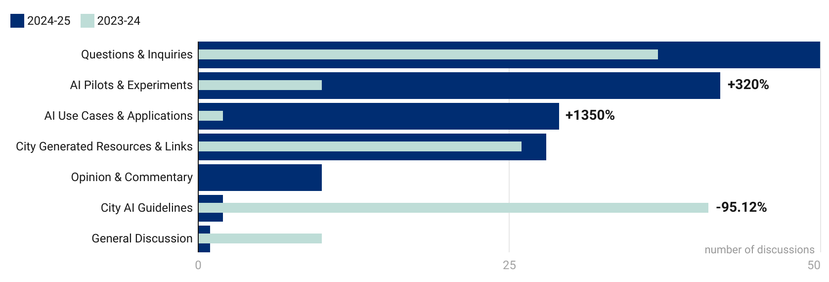 Most notably, the focus of those posts have shifted dramatically over the last years. In the first year, the largest category of posts were those about AI guidelines, as cities began to explore the new technology. But in the last year, such posts dropped by 95 percent, while posts about AI pilots jumped 350 percent and those about AI use cases and applications jumped 1350 percent.